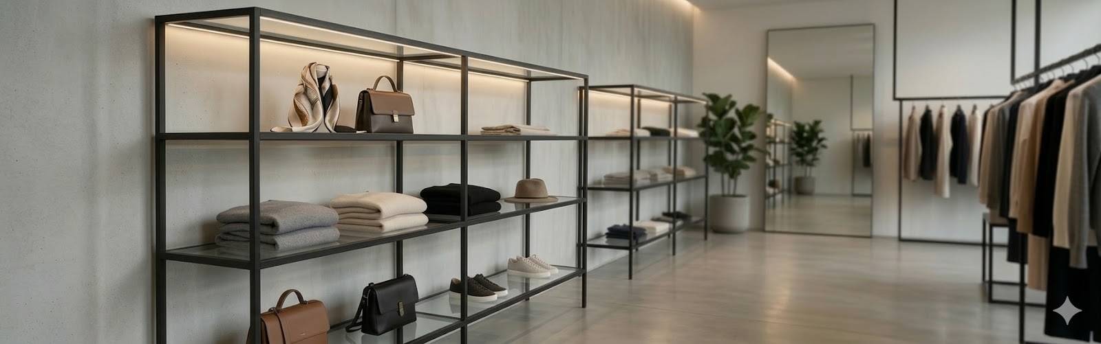 ガラス天板は光を通すため、商品をより美しく見せ、空間に開放感を生み出します。金属加工技術を活かして製作されたフレームは、精度の高い仕上がりでシンプルながら上質な印象を与えます。